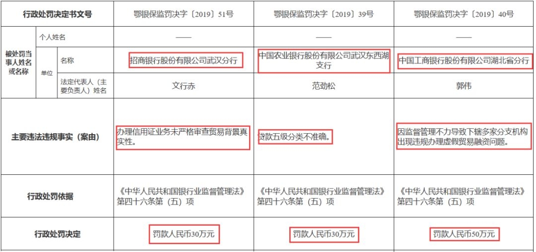 据《中华人民共和国银行业监督管理法》(以下简称《银监法》)第四十六条第(五)项相关规定,工行湖北省分行因监督管理不力导致下辖多家分支机构出现违规办理虚假贸易融资问题,被罚款50万元;农行武汉东西湖支行因贷款五级分类不准确被罚款30万元;招行武汉分行因办理信用证业务未严格审查贸易背景真实性被罚款30万元。