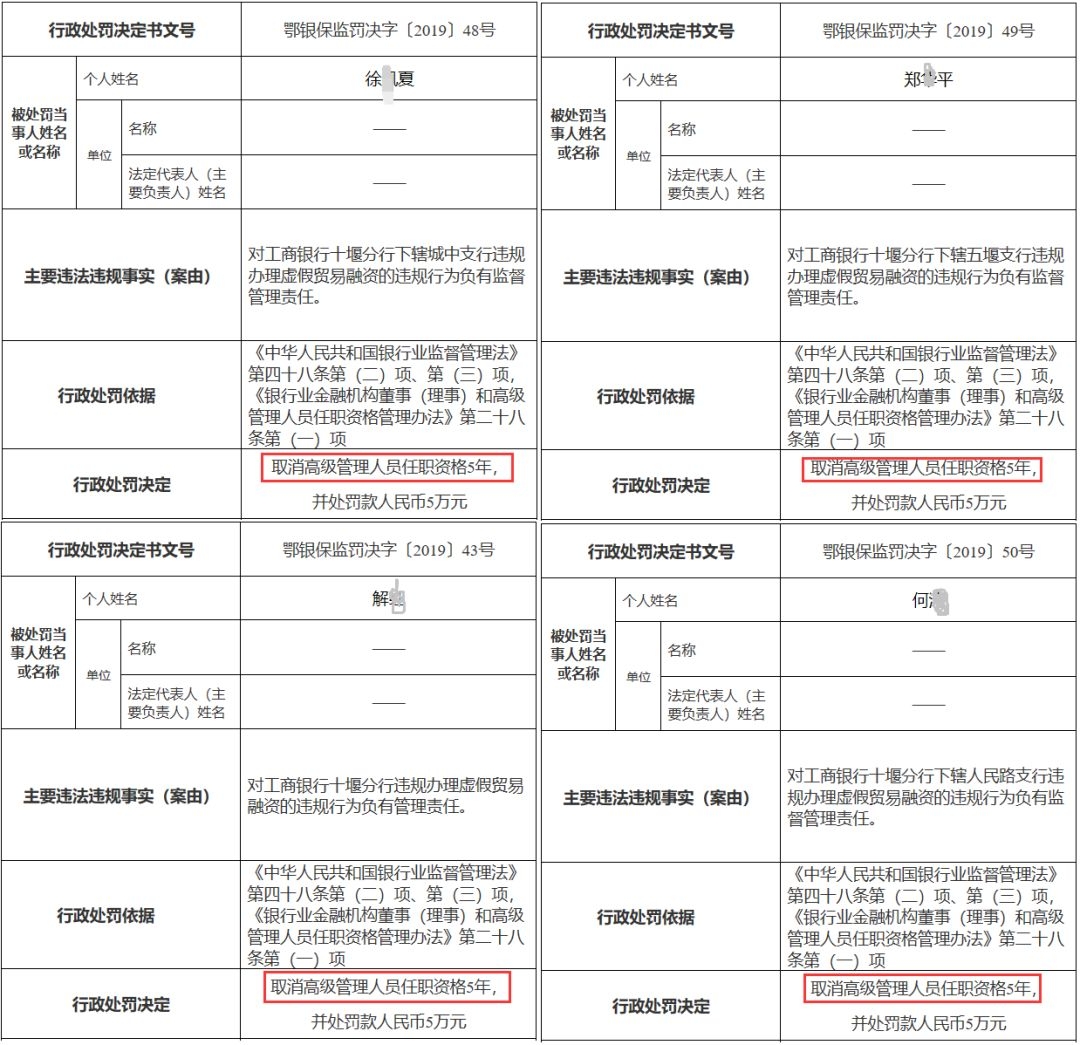 工商银行十堰分行的解某、工商银行十堰分行下辖城中支行的徐某夏、工商银行十堰分行下辖五堰支行的郑某平、工商银行十堰分行下辖人民路支行的何某均因对违规办理虚假贸易融资的违规行为负有监督管理责任,均被湖北银保监局取消高级管理人员任职资格5年,同时均被罚款5万元。