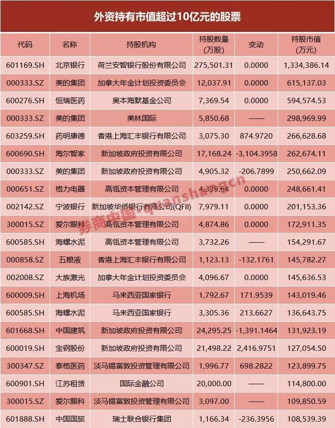 就持股市值来看,北京银行、美的集团、恒瑞医药是QFII持股市值最大的三只股票,分别持有133.43亿元、116.47亿元、59.45亿元。其中,北京银行被荷兰安智银行持有;美的集团被加拿大年金计划、美林国际、新加坡政府投资三家机构持有;恒瑞医药则被奥本海默基金持有。