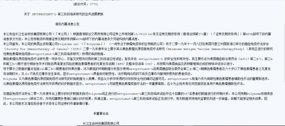 不过最近,李嘉诚家族控股的长江生命科技(00775)公告称,在美国马里兰州国家港口举行的癌症免疫疗法学会(Society for Immunotherapy of Cancer)(SITC)二零一九年度年会上展示其从黑色素瘤抗原疫苗免疫疗法研究(Melanoma Antigen Vaccine ImmunotherapyStudy)(其现正进行的研究性黑色素瘤候选疫苗seviprotimut-L第三阶段临床研究)所得的临床数据。可谓给“李香山”这类患者带来了福音。