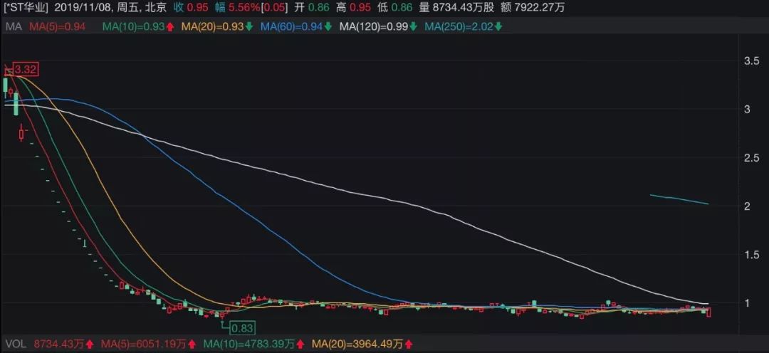 最终,*ST华业在11月8日上演“地天板”,股价报0.95元/股。这意味着,如果未来两个交易日股价在现在基础上涨逾5分钱,*ST华业暂时脱离面值退市危机。