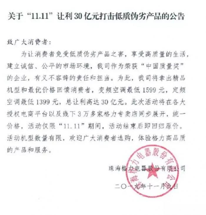 据悉,此次活动将在格力各大授权电商平台以及线下3万多家格力专卖店同步展开,统一价格。而在公告中,格力明确这次让利的目的是为了让消费者免受低质低劣产品之害,享受高质量的生活,建立诚信、公平的市场环境。