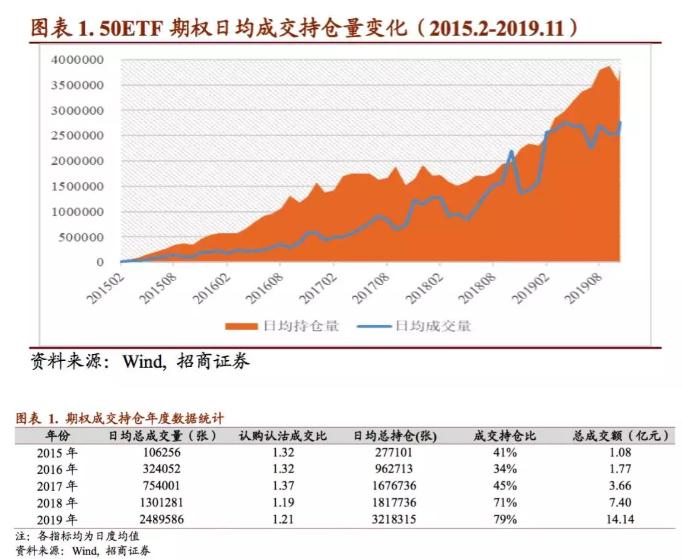 据招商证券统计,上证50ETF期权上市以来,年度日均总成交量从10万张水平上升到超过200万张,总持仓量从不足30万张上升到超过400万张,实际日均成交金额从1亿元上升到14亿元,成交对应的名义本金达到了600亿元的水平,市场容量有明显提升,也反映出市场投资者对期权工具的需求巨大。