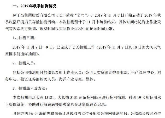 獐子岛公告称,本次的抽测人员包括公司抽测船只的船长及船上作业人员;公司贝类资源养护事业部、生产管理中心、财务中心、投资证券部相关人员;海洋产业专家,媒体。