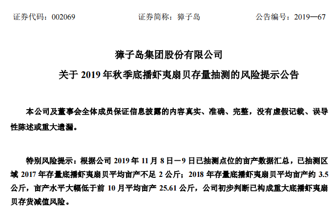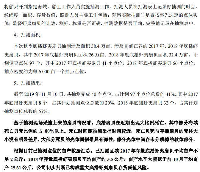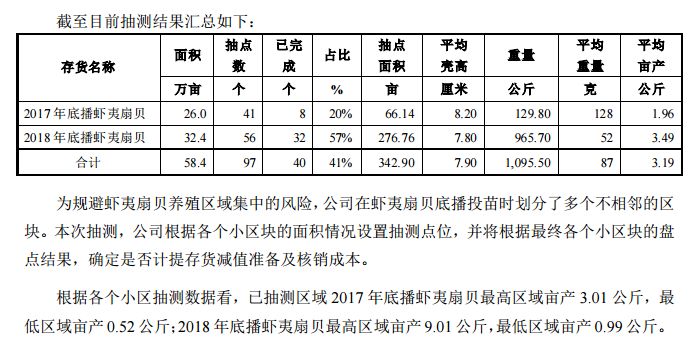 根据目前已抽测点位的亩产数据汇总,已抽测区域2017年存量底播虾夷扇贝平均亩产不足2公斤;2018年存量底播虾夷扇贝平均亩产约3.5公斤,亩产水平大幅低于前10月平均亩产25.61公斤,公司初步判断已构成重大底播虾夷扇贝存货减值风险。