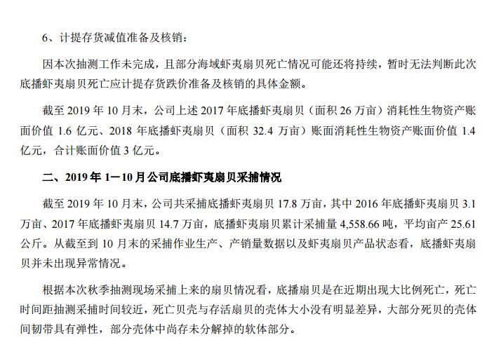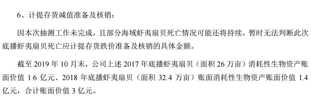 截至2019年10月末,公司上述2017年底播虾夷扇贝(面积26万亩)消耗性生物资产账面价值1.6亿元、2018年底播虾夷扇贝(面积32.4万亩)账面消耗性生物资产账面价值1.4亿元,合计账面价值3亿元。