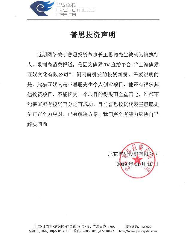 11月11日,普思投资发布声明称,近期网络关于普思投资董事长王思聪被列为被执行人、限制高消费报道,是因为熊猫TV直播平台倒闭而引发的投资纠纷。目前普思投资代表王思聪正在全力应对,已有解决方案,我们完全有能力尽快自己解决问题。