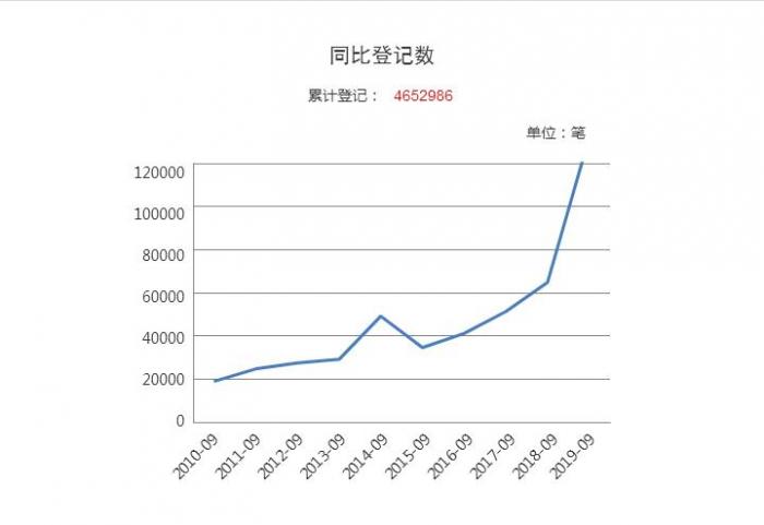 11月11日,根据央行征信中心动产融资统一登记公示系统数据,截至2019年9月,动产融资登记系统累计登记465.30万笔。2019年9月,动产融资登记突破12万笔,较去年9月的6万笔翻了一倍。