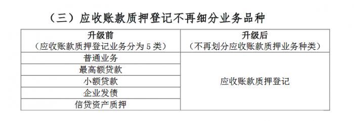 应收账款质押登记不再细分业务品种,将原来的普通业务、最高额贷款、小额贷款、企业发债、信贷资产质押等5类,升级后不再划分应收账款质押业务种类。