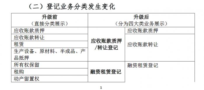 其中,升级前得11个业务分类改造为四大类业务。第一大类为应收账款质押/转让登记,包括应收账款质押、应收账款转让。