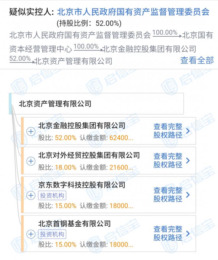 根据启信宝显示,北京资管的股东共有四家,除了大股东北京金控外,还包括北京对外经贸控股集团有限公司、京东数字科技控股有限公司、北京首钢基金有限公司。其中,北京金控持股52%,其余三家分别持股18%、15%、15%。