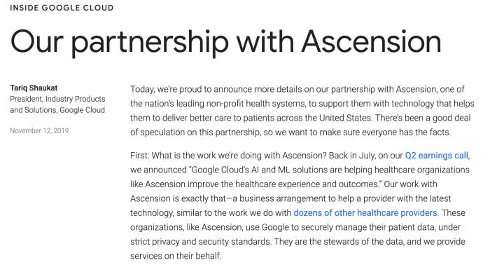 报道发出后,阿森松集团和谷歌迅速发布了新闻稿,正式宣布了双方的这一合作,并强调了行为的合法性,称这项合作旨在帮助医疗机构更好的帮助患者,并没有违反美国1996年颁布的《健康保险便利和责任法》(HIPAA)在内的各项医疗法规。