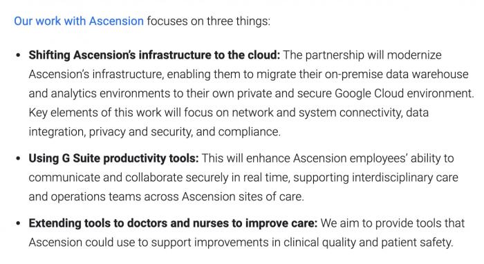根据谷歌的新闻稿,双方合作主要目标是三方面:将阿森松的基础设施转移到云端;运用谷歌G Suite的生产力工具;给医生和护士提供工具。