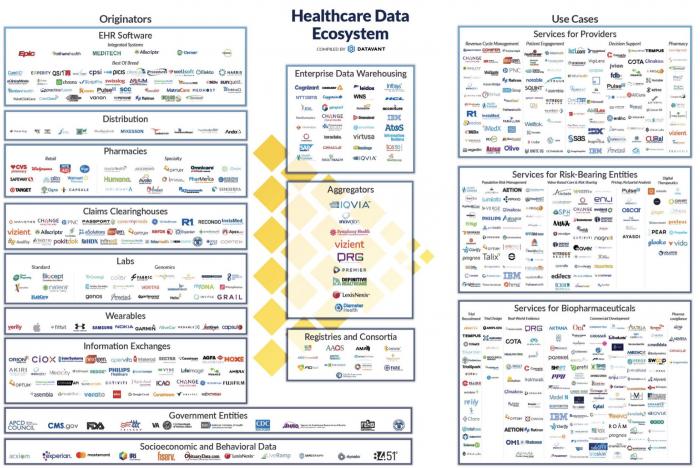 正如上图所示,更有几百上千个生态体系上的中小型公司,构成以医疗数据的收集方(比如可穿戴设备, 数据交易平台、软件提供商等全方位的数据平台。