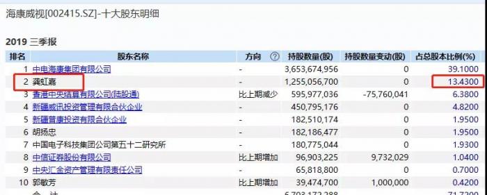 在海康威视2010年上市之后的7年时间里,龚虹嘉也只是少量套现,依然高比例持股(截至最新数据,龚虹嘉持有海康威视比例高达13.43%,为海康威视第二大股东)。