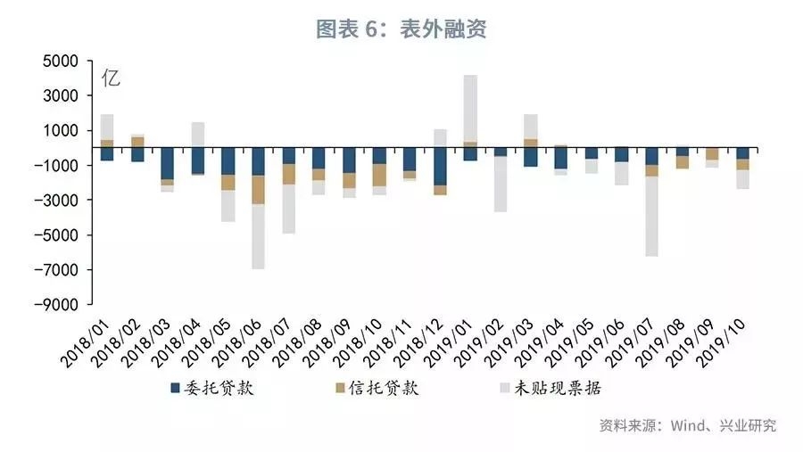 从表外融资来看,信托贷款降幅已经趋于稳定。7月以来信托贷款每月降幅稳定在600亿至700亿的区间之内。10月未贴现票据和委托贷款的规模有所下降,但降幅均未超出季节性因素可以解释的范畴。