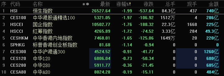 香港恒生指数近四个交易日,三日出现杀跌,最大跌幅超1300点。恒指今日收报26571点,跌493点或1.8%。国指跌171点或1.6%,报10519点。大市成交额791.05港元。