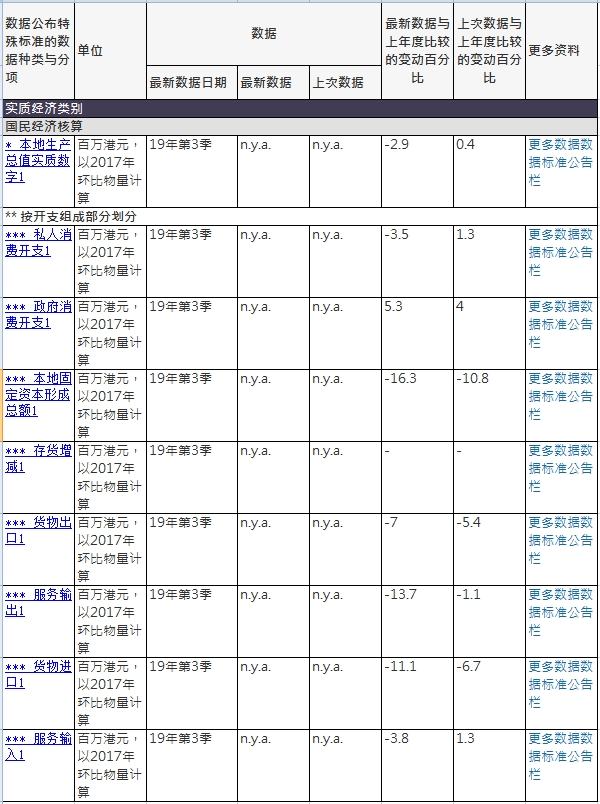 近日,香港特区政府公布今年第三季度经济数据:GDP总值较上年同期下跌2.9%,为2009年国际金融危机以来最大跌幅,今年经济大概率将出现负增长。第二季度下跌0.5%,第三季度跌幅扩大到3.2%,连续两个季度下跌,已符合技术性衰退特征。来自香港金管局的数据显示,除了政府开支,各项数据都在下滑。其中服务输出大幅下滑13.7%。