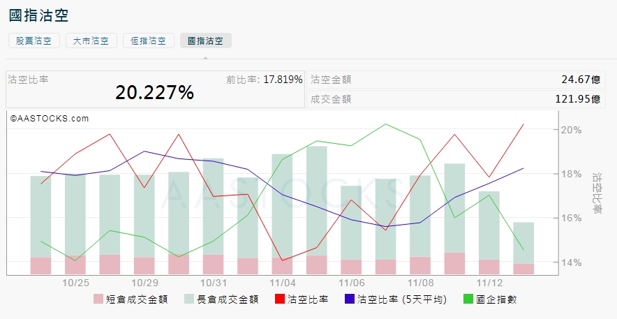 从11月8日之后,香港市场的沽空比例突然大幅增长。阿斯达克财经的数据显示,恒生指数11月8日的沽空比例仅为7.8%,但这一比例在11月11日暴增至22%以上,目前仍在21%以上水平,沽空比例增长幅度高达180%以上。