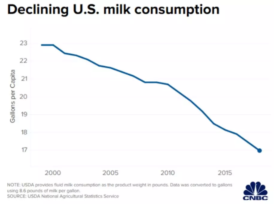 曾有分析认为,造成美国牛奶消费量下滑的主要原因在于美国人喝牛奶的频率急剧下降——他们拥有了比以前更多的选择,如燕麦奶和豆奶。