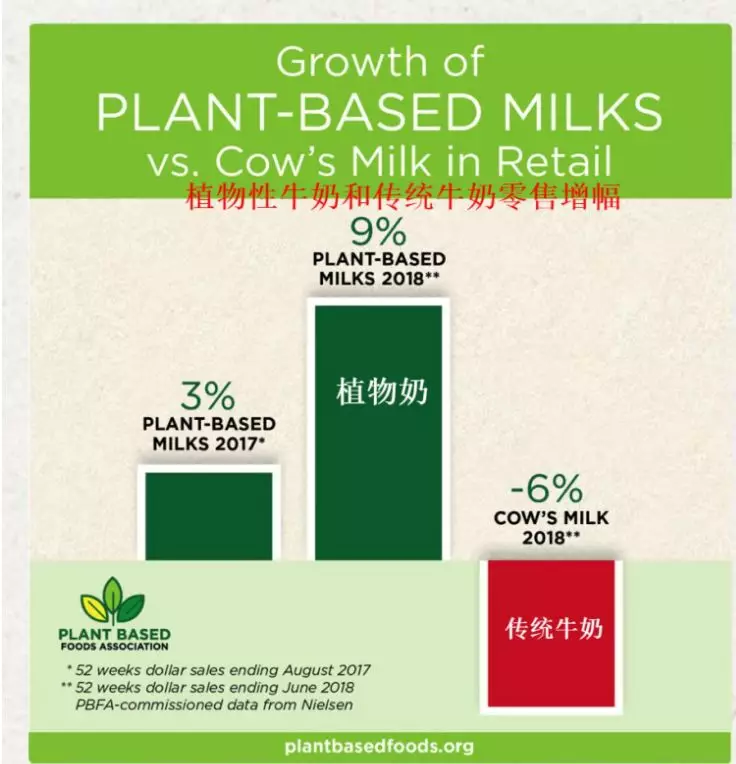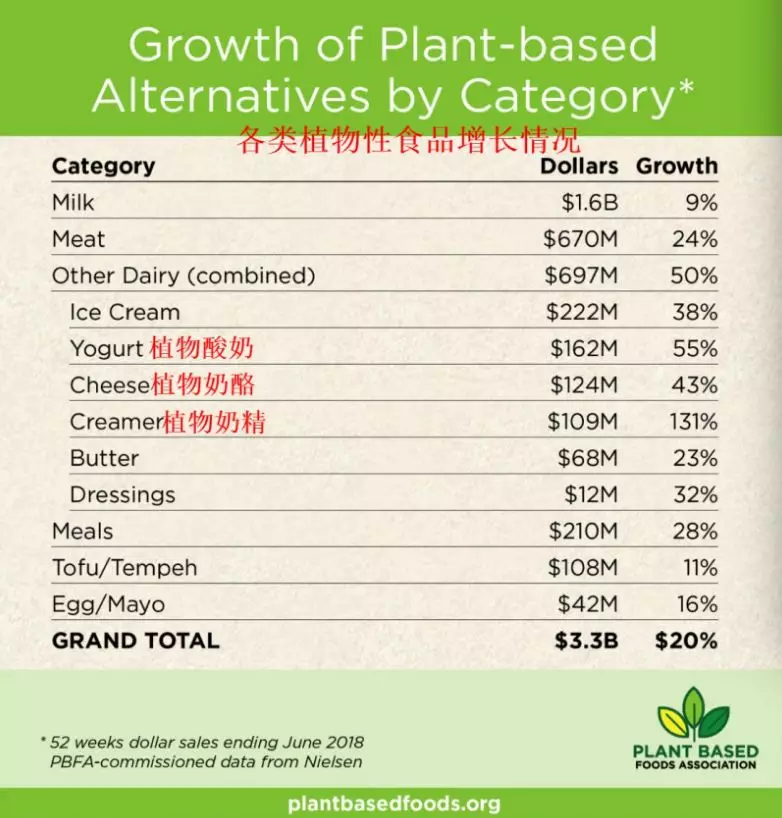 2017年6月~2018年6月,植物性乳制品中有三种销售额增长非常迅速:植物奶酪增长了43%,销售额达1.24亿美元;植物酸奶增长55%,销售额为1.62亿美元;植物奶精比前一年增长了131%。
