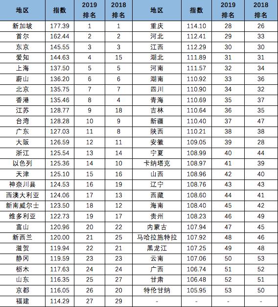 前十榜上中国占据五席,分别是上海(5)、北京(7)、香港(8)、江苏(9)、台湾(10)。