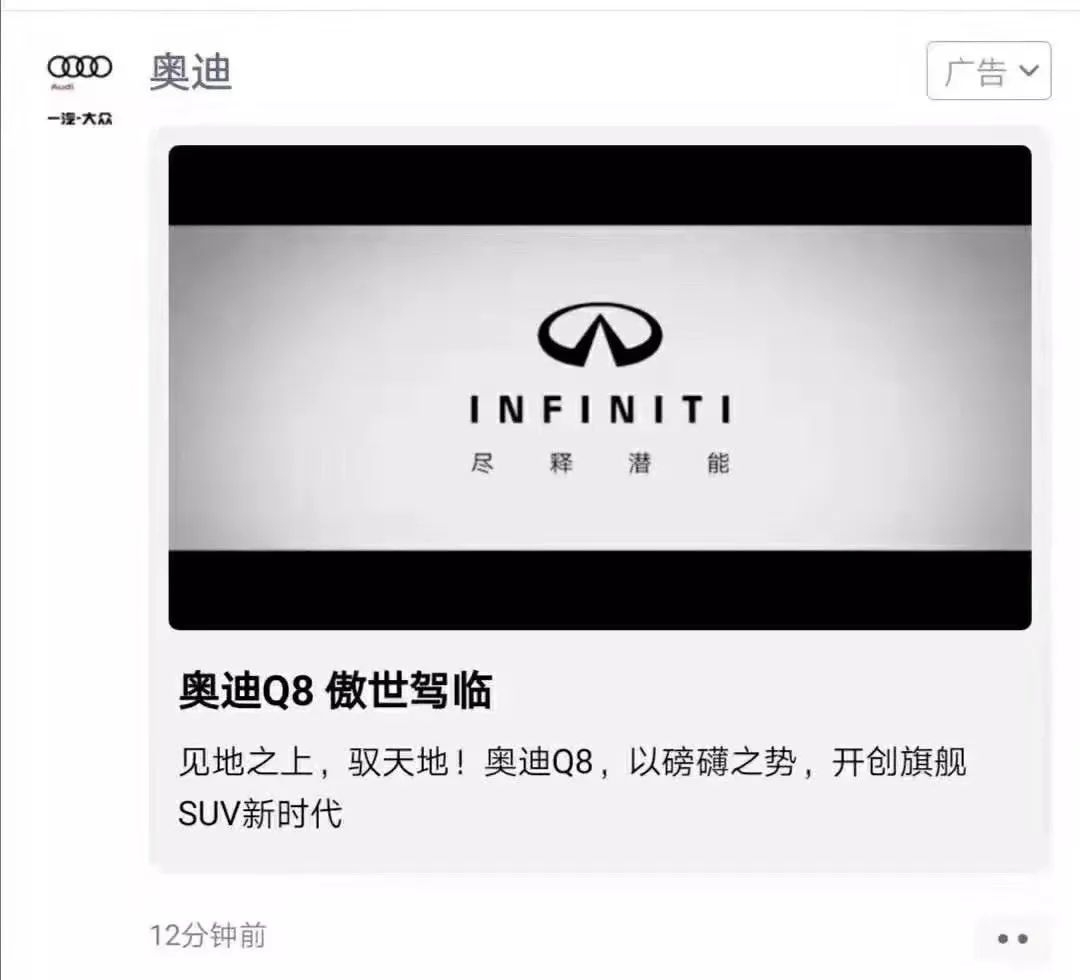 原本平平无奇的周三,一大早被朋友圈的一条广告点燃。事情的起因很简单,奥迪在微信朋友圈投放了奥迪Q8的视频广告,但播放的内容却是英菲尼迪车型的宣传视频,视频最后展示的也是英菲尼迪的品牌标志和宣传语。该视频被手持八倍放大镜的网友发现之后,引发了大量关注和传播,同时也在朋友圈引起刷屏热议,奥迪和英菲尼迪由此被送上了微博热搜。