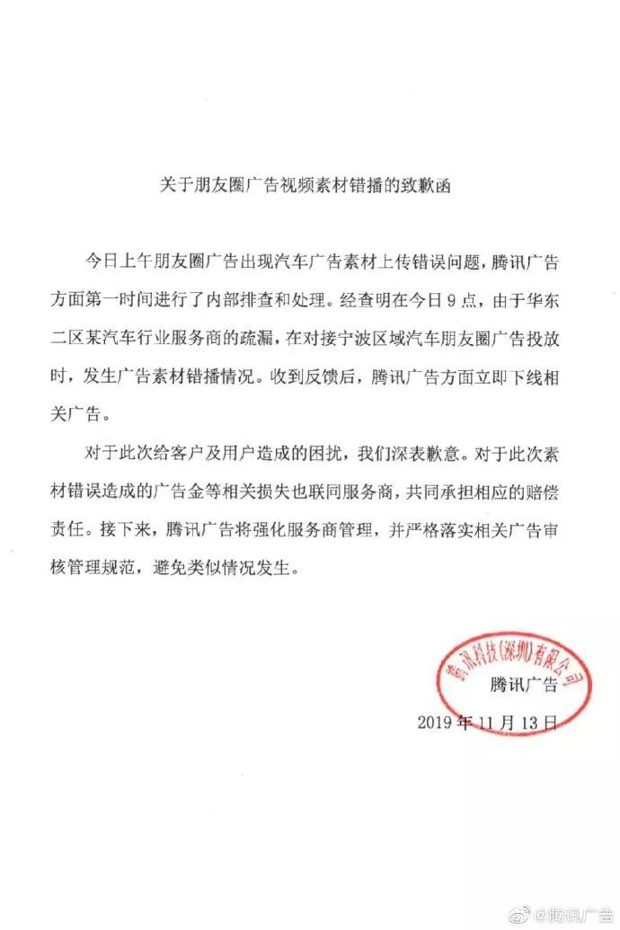 当天,腾讯广告针对这一乌龙事件发布致歉声明,表示朋友圈广告出现了素材上传错误问题,已第一时间进行了内部排查和处理。经查明,由于华东二区某汽车行业服务商的疏漏,造成了素材错播情况。收到反馈后,腾讯广告方面立即下架了相关广告。