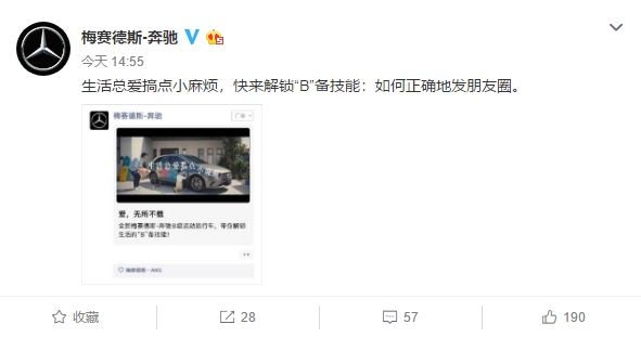 同为德系兄弟,奔驰也没有放过跟奥迪互动的机会。但相比沃尔沃的直白,奔驰的调侃来得更含蓄。官微po出了奔驰B级车的图片,文案则意味深长:生活总爱搞点小麻烦,如何正确地发朋友圈。