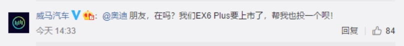 作为新势力造车企业,威马显然也不想错过这个热度。官微@奥迪求关注:朋友,在吗?我们EX6 Plus要上市了,帮我也投一个呗!