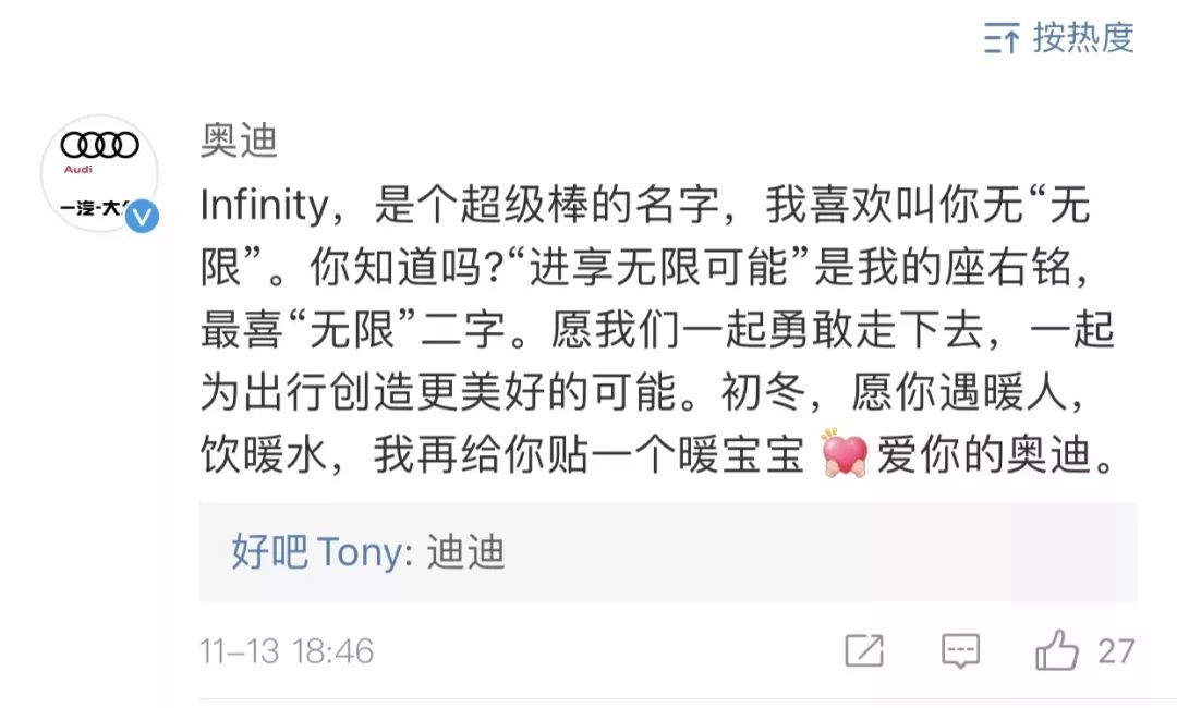 作为本次事件的另一个主角,英菲尼迪算得上淡定。直到11月13日晚间,英菲尼迪的回应才姗姗来迟。官微po出两大品牌车标合二为一的图片并@奥迪表示:懂你,兄弟。送给英菲尼迪的30周年生日贺礼收到。让我们一起 启迪未来,尽释潜能。随后,奥迪在评论区暖心互动称:Infiniti,是个超级棒的名字,我喜欢叫你无“无限”。愿我们一起勇敢走下去,一起为出行创造更美好的可能。
