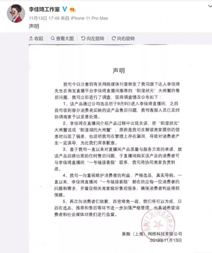 对此,李佳琦工作室于13日下午发布声明,称李佳琦方面表示在直播间介绍产品过程中出现失误,把“阳澄状元”大闸蟹说成“阳澄湖的大闸蟹”,“解读商家提供的信息时出现了偏差”。今后会加强管理。