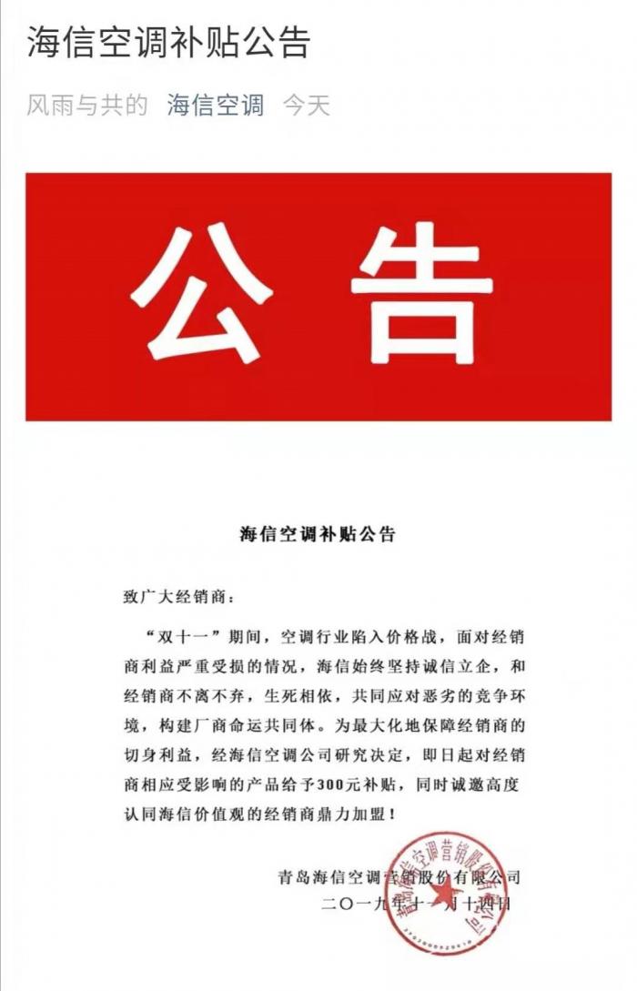 由格力触发的空调价格战持续发酵,11月14日凌晨,海信空调在官方公众号和官方微博上同时发布公告。“为了共同应对恶劣的竞争环境,将对经销商受影响的产品给予300元补贴。”公告中,海信对“格力双十一突然降价”透露出满屏的不满。