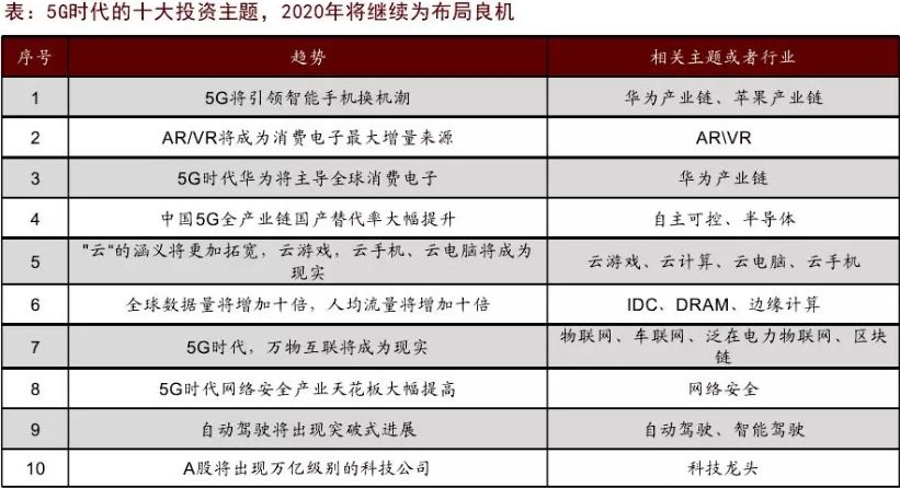主题投资方面,张夏认为,2020年最强主线依然来自于5G带来的新科技周期,并提出5G新科技周期下的十大投资主题,包括华为产业链、VR/AR、自主可控、网络安全等。同时张夏认为,对比美股市值结构,由我国主导的5G时代将会给A股带来万亿级科技公司。