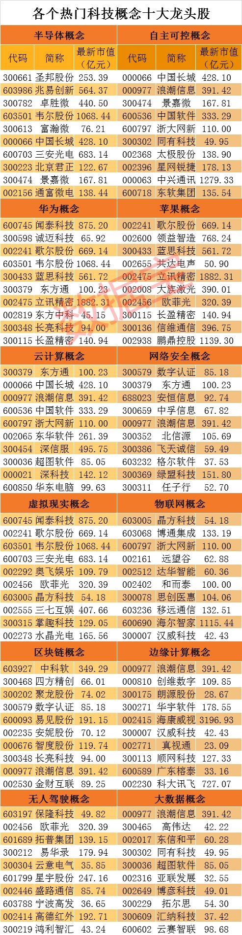 我国已经处在一个科技创新大周期的起点,成为众多策略分析师共同的观点。据此,证券时报·数据宝推出5G时代十大主题投资龙头股名单,按照8月7日以来涨幅排名选取概念股涨幅前十名作为龙头,包括了半导体产业概念、华为概念、区块链概念等十大概念板块的龙头股名单,供投资者参考。