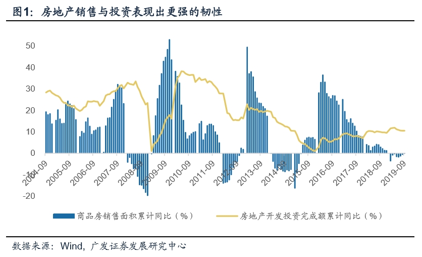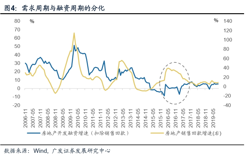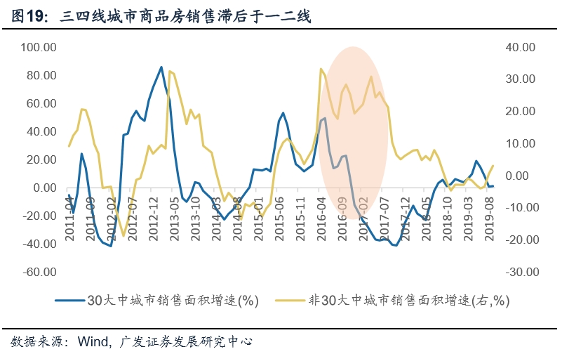 在以往几轮周期中,货币政策宽松往往是房地产回升的主要动力,而这一轮房地产周期则先后受到了2014-15年货币宽松与2016-18年棚改货币化这两轮政策的提振作用,前者主要作用于一二线,后者主要作用于三四线,两种力量相互叠加,因此对房地产销售与投资来说,需求动力更足,韧性更强。