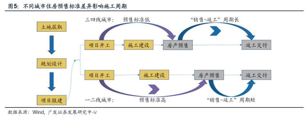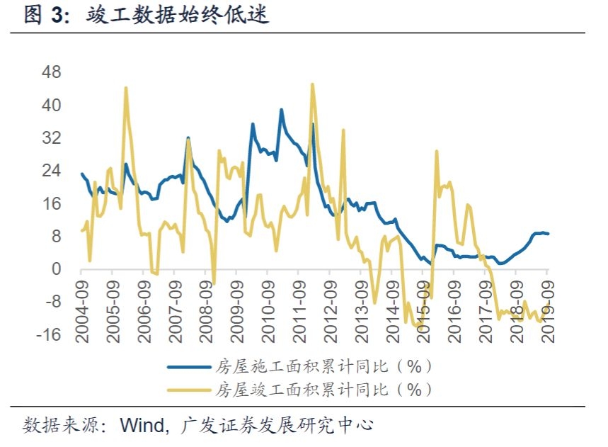 以往的几轮房地产周期往往伴随着货币宽松,一方面有利于商品房销售,另一方面有利于开发商融资,施工流程的推进极为顺畅;但对于这一轮的三四线城市来说,2016-18期间棚改带来的需求回升与金融去杠杆带来的融资收紧并存,房地产商施工需求强(销售端需求旺盛,且多为期房销售,施工周期结束后方可交房),但施工意愿差(融资偏紧,施工端资金链受影响),整个施工进度明显放慢,甚至还有一部分暂时停工。