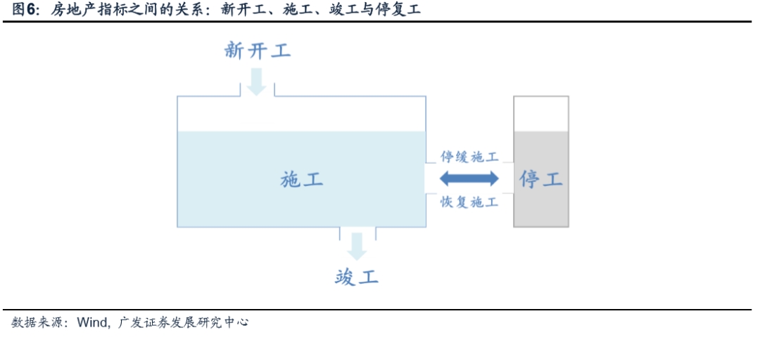 根据统计局的定义,新开工与竣工是时点数据,而施工是存量数据。如果把施工比喻成一个蓄水池,那么新开工可以认为是“进水管”,而竣工近似于“出水管”,施工同时受到上期存量、新开工(增量)以及竣工三方面的影响。除此之外,停工与复工也是影响施工的重要因素,地产项目的停工或复工行为在很大程度上取决于企业的资金状况。注:根据统计局官方定义,施工面积 = 本期新开工+以前开工跨入本期继续施工+以前停缓建在本期恢复施工+本期施工后又停缓建+本期竣工