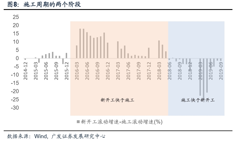 对这一轮周期来说,施工经历了两个阶段。2016年初到2018Q1是施工偏慢的阶段,新开工持续加速,且增速快于施工;而2018Q2至今,施工开始加速,且增速快于新开工。