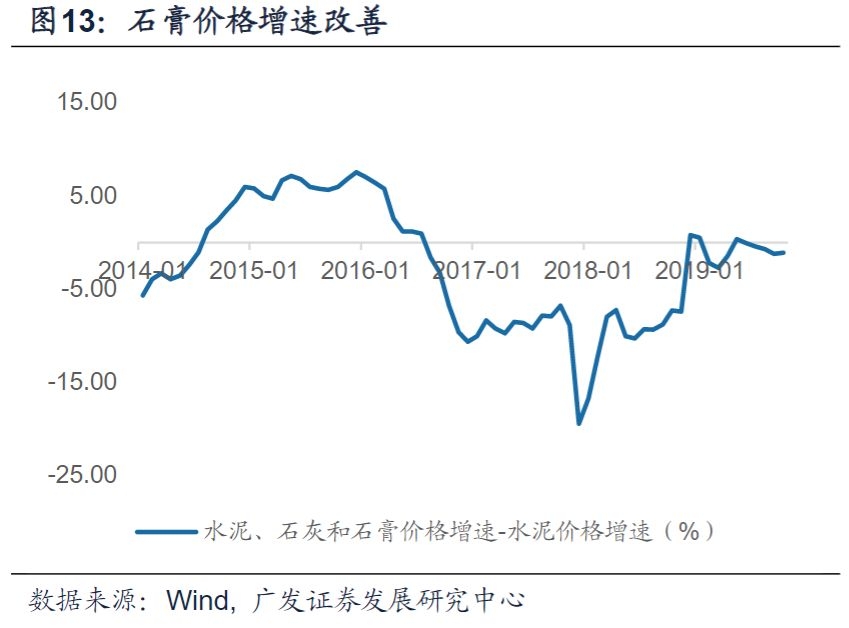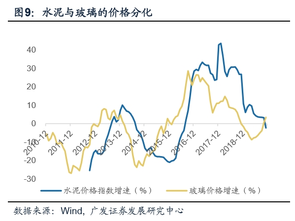 目前房地产周期正在由施工向竣工环节加速切换。按照房地产项目运行规律,正常情况下“新开工-竣工”周期需要耗时2-3年,而这一轮施工周期相对更长。这一轮施工经历了两个阶段:2016年初-2018Q1,新开工增速快于施工;2018Q2至今,施工增速快于新开工。这也对应了宏观调控政策的“去杠杆”与“稳杠杆”两个阶段,本质上是宏观政策对房地产周期的熨平。无论以哪个阶段作为起点,目前都已经接近施工周期(2-3年)尾声。微观数据反映出水泥与玻璃的景气度在边际上发生了微妙分化,也侧面印证了施工向竣工切换的逻辑。