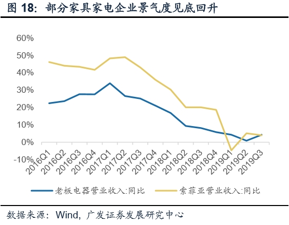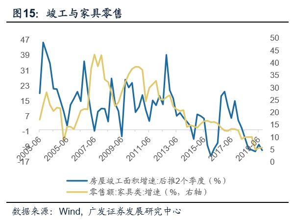 第三阶段,家具家电购置。历史数据显示家具与家电零售数据往往滞后于竣工指标2-4个季度,但以往周期中传导顺序往往是“竣工-装修-家具家电购置”,而这一轮周期可能为“装修-竣工-家具家电购置”,因此竣工指标到家具家电需求回升的时滞可能将有所缩短。目前竣工链条景气度已经传导至第二阶段,而第三阶段的景气回升仍值得期待。