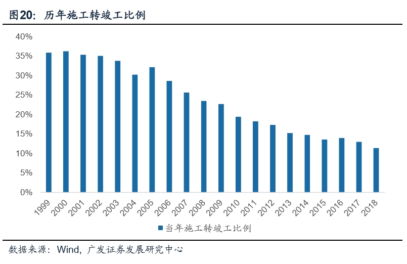 第一是根据过往每一轮房地产周期的运行规律,“预售-施工-竣工”周期大约需要耗时2-3年,而这一轮施工周期可能更久,考虑到商品房销售峰值大约出现在2016-17年,目前(19Q4前后)大致处于施工周期的尾声阶段。