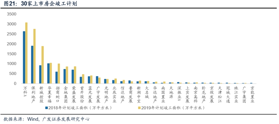 我们基于两点逻辑判断,目前(2019Q4)已大致处于施工周期顶部:第一是根据房地产周期运行规律推演施工阶段的结束时点,商品房销售峰值出现在2016-17年,而“预售-施工-竣工”周期大约需要耗时2-3年,本轮可能更久;第二是房地产企业竣工计划对项目竣工形成了硬性约束,2019年30家房地产上市公司竣工计划同比增长了30%,一旦施工项目进入竣工环节,必然带动施工增速下降。
