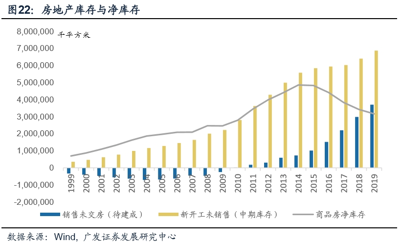 基于商品房“净库存”指标的观察。根据广发地产组的研究,地产库存可以从“长期库存”、“中期库存”、“短期库存”三个层面进行观察,分别代表了“拿地未开工”、“开工未销售”、“建成未销售”三种层次的含义。由于近几年预售部分大幅增长,我们将“销售未建成”的预售(待交房)部分也纳入库存考量,以中期库存与待交房部分之差作为“净库存”指标,观察库存的变化情况。