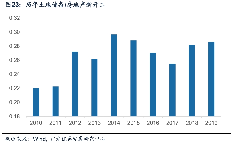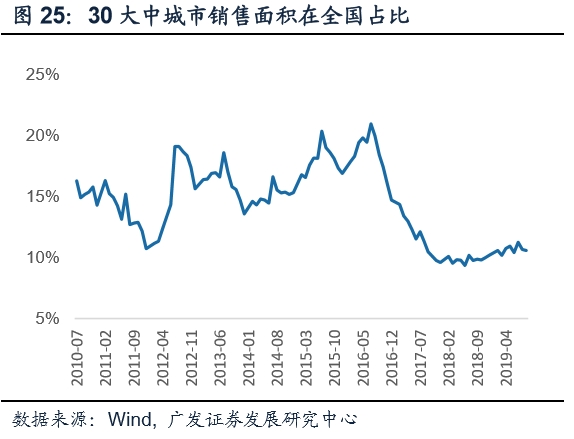 但这种压力是否真的会大幅显性化则需要进一步观察。企业层面的土地储备与新开工是观察新一轮房地产周期的重要指标,而新开工也受到土地储备制约。我们以历年“新开工面积/待开发土地面积”指标进行观察,今年的土地储备水平高于2017与18年。在土地储备偏高/房价相对稳定两个因素的影响下,考虑到“因城施策”的政策基调以及三四线楼市占比将近九成,与若开发商融资规模没有发生大幅收缩,压力则会大致可控。