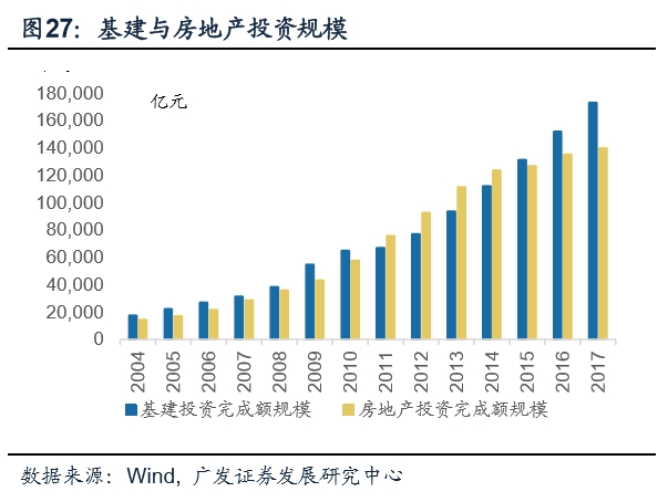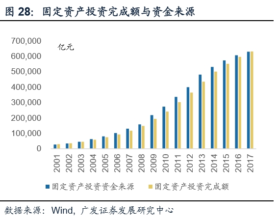 如何理解房地产与基建、房地产周期不同环节在经济中的作用?市场习惯于通过房地产与基建固定资产投资规模数据来理解房地产与基建。在一系列经济指标中,固定资产投资完成额是衡量固定资产投资需求最常用的指标,但由于统计质量、统计口径、统计制度改革等原因,这一数据的指示意义显著下降(见我们的报告《统计制度改革如何影响固定资产投资?》)如果根据这一指标进行观察,2017年基建投资规模(17.3万亿)远远高于房地产投资(11.0万亿),这是否意味着基建对经济的作用大于地产?事实并非如此。尽管从字面意义上,“固定资产投资完成额”是代表了投资需求的数据,但实际上这一指标与“固定资产投资资金来源”极其接近,更多地代表了“融资规模”而不是“实际建设规模”。