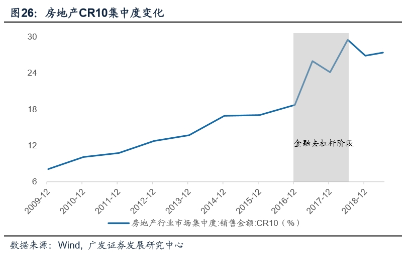 房地产行业集中度的变化也证明了“需求旺盛”与“政策收紧”是最有利于行业龙头提升的环境。我们以CR10销售金额作为房地产集中度的观察指标,发现2016年底到2018上半年期间,房地产集中度提升最为迅速,短短6个季度内从18.72%迅速提升到29.54%。而这段时间恰好是棚改力度最大的阶段(需求旺盛),也是金融去杠杆、地产企业融资相对困难的阶段(政策收紧),属于最有利于龙头企业景气度的经济环境。2018下半年至2019上半年,虽然销售、新开工、施工等指标显示行业景气度仍然很高,但融资环境逐渐缓和,行业集中度反而下降(29.54%到27.40%)。