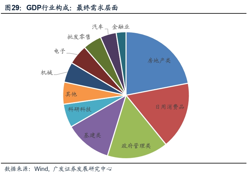 具体到房地产相关行业,最终需求层面(投资+消费+净出口)在GDP中所占权重为18.6%,其中房屋建筑业13.9%,房地产业4.7%;前者与房地产建安(施工)高度相关,后者与房地产销售收入(销售与服务)高度相关。