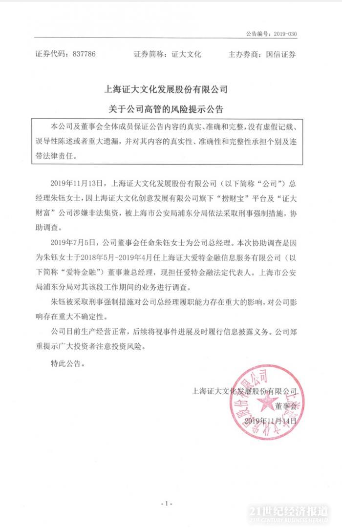 2019年7月5日,在证大P2P平台风险爆发之前,证大文化董事会任命朱钰为总经理。证大文化在公告中称,本次协助调查是因为朱钰于2018年5月至2019年4月任上海证大爱特金融信息服务有限公司董事兼总经理,现担任爱特金融法定代表人。上海市公安局浦东分局对其该段工作期间的业务进行调查,朱钰被采取刑事强制措施。该事宜对公司总经理履职能力存在重大的影响,对公司影响存在重大不确定性。