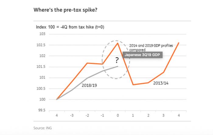 (前后消费税上调和季度增速的比较 来源:ING银行)